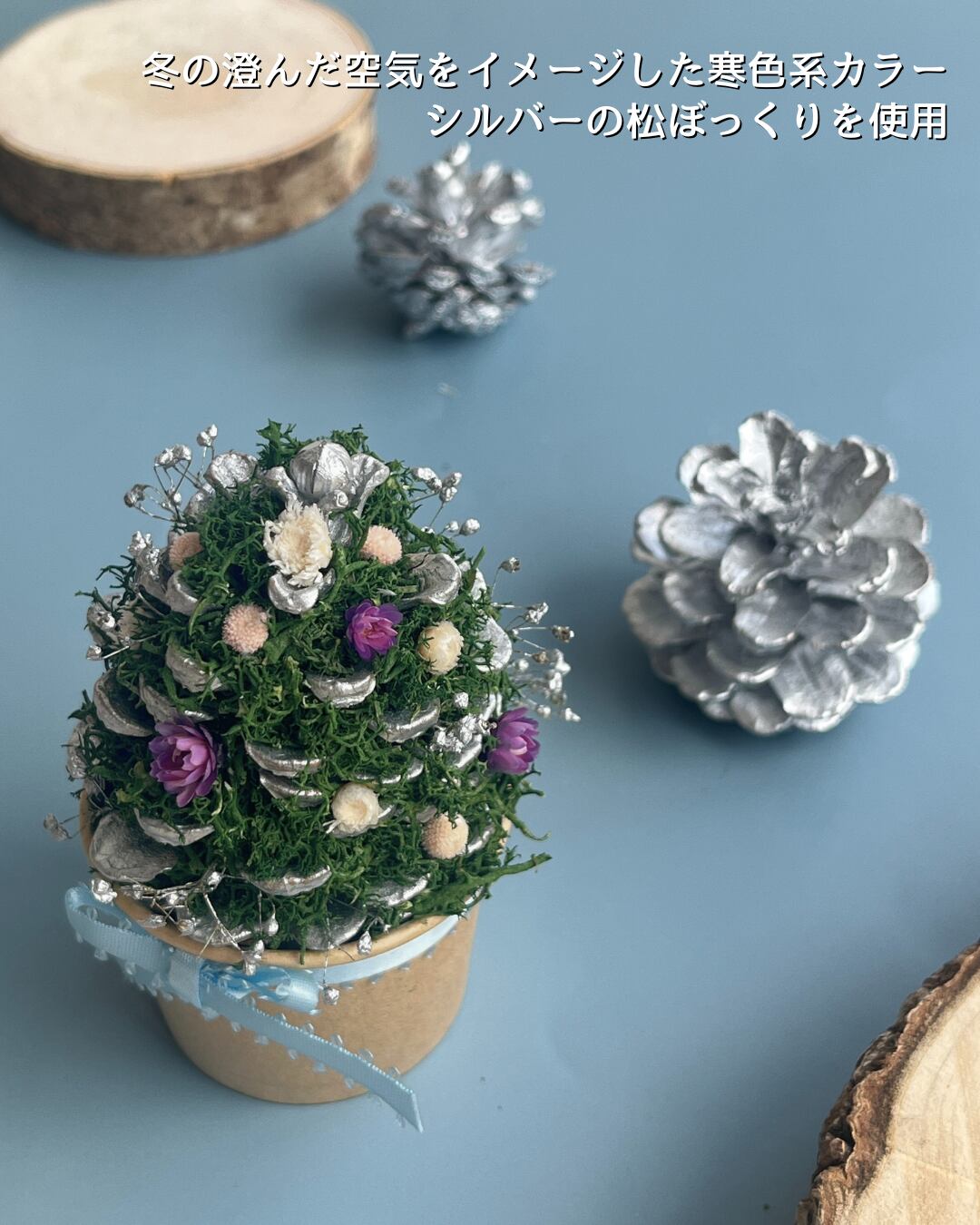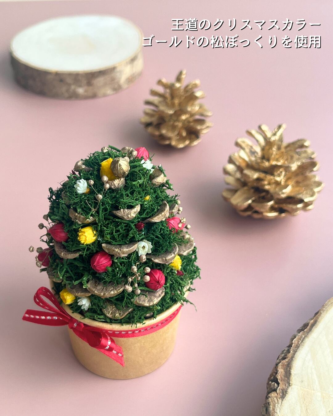 ツリーのベースにはメタリックカラーの松ぼっくりを使用。